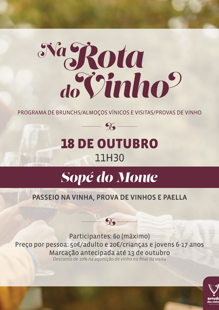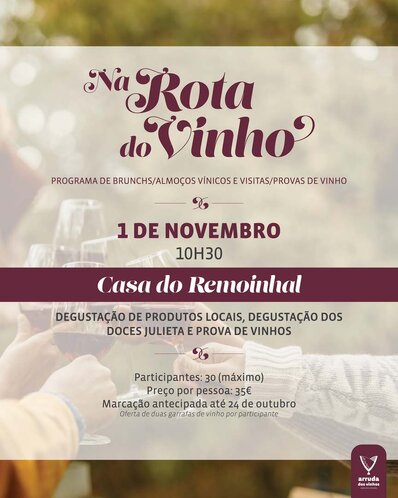 O programa de brunchs/almoços vínicos e visitas/provas de vinho em Arruda dos Vinhos é promovido pelo Município de Arruda dos Vinhos em parceria com os produtores de vinho locais.