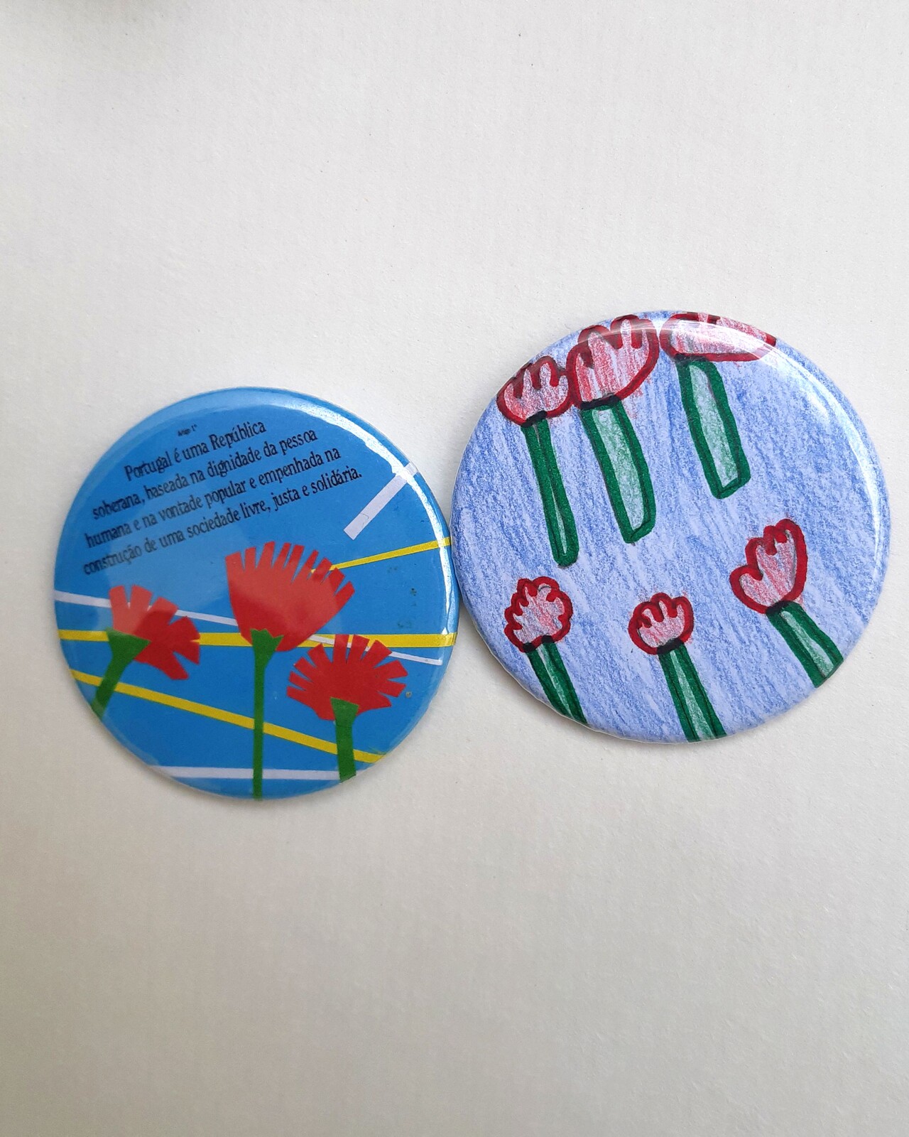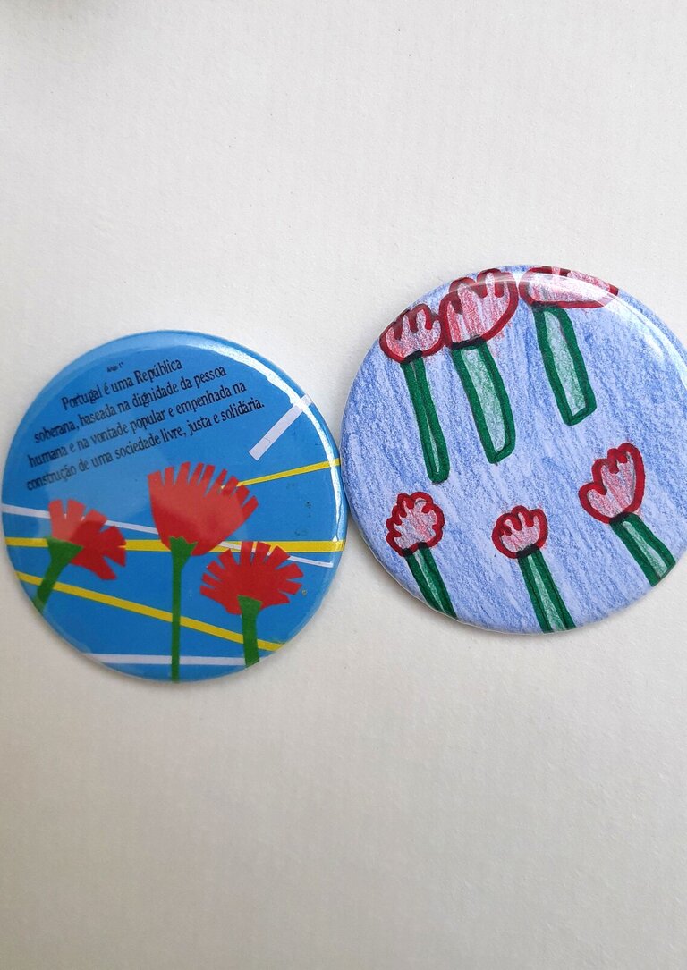 Pesquisando entre papéis preenchidos com padrões, cores, pedaços de poemas e citações da Constituição da República Portuguesa, cidadãos pequenos e grandes farão seus alguns recortes e palavras, combinando-os numa mensagem de usar ao peito, a falar com quem passa da Revolução e das suas conquistas.