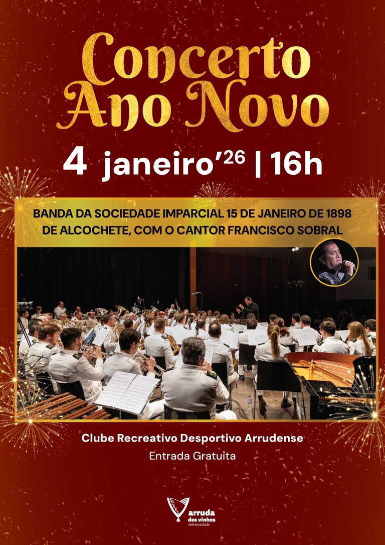 O Município de Arruda dos Vinhos recebe a Banda da Sociedade Imparcial 15 de Janeiro de 1898 de Alcochete, para abrilhantar o Concerto de Ano Novo, com o cantor Francisco Sobral.