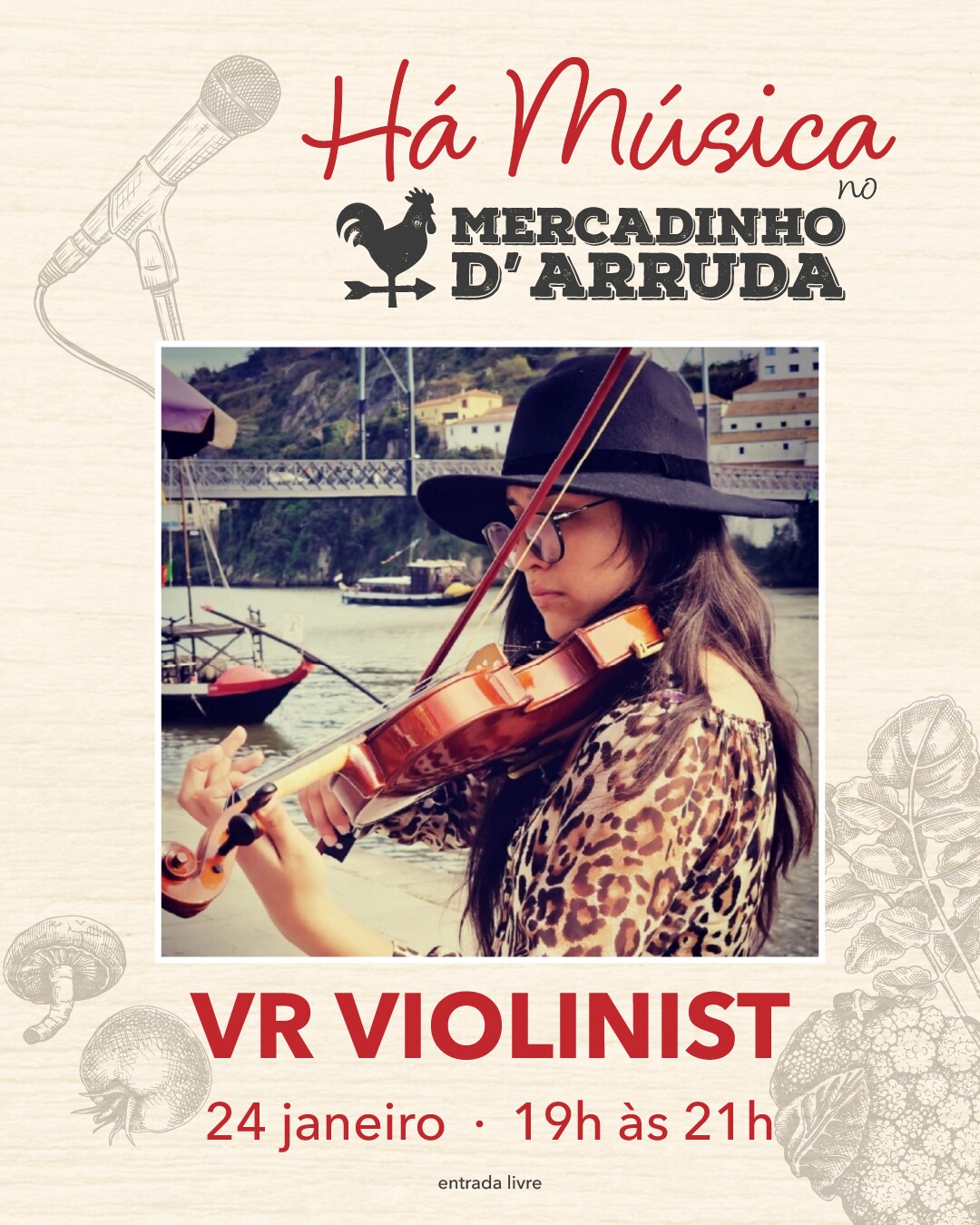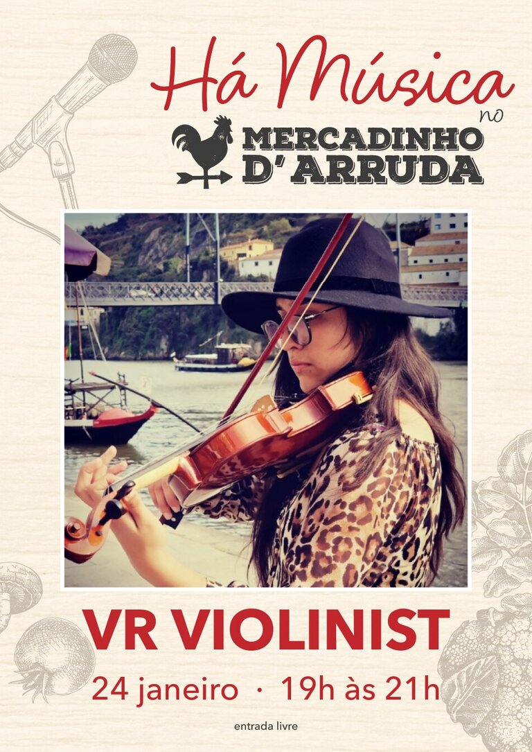 Adicionar a calendário2026-01-24 00:00:002026-01-24 00:00:00Europe/LisbonHá música no Mercadinho d'Arruda - VR ViolinistUm final de tarde especial no Mercadinho d'Arruda, com o talento da violinista Viviana Forero que apresenta uma performance a solo, com músicas intimistas e animadas.Mercadinho d'Arruda